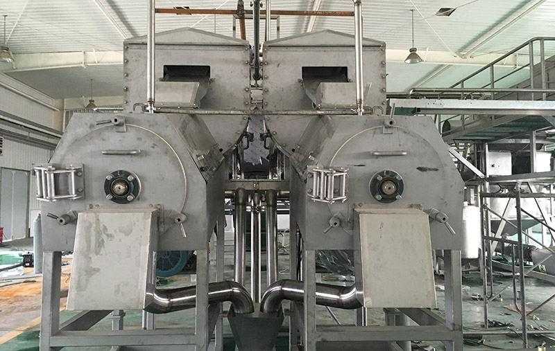 6. 去核制浆:经过破碎机初破碎的红枣通过螺杆泵进入去核制浆机的辣椒视频下载成人APP室内,通过辣椒视频下载成人APP叶片的高速旋转作用下使物料获得离心力而抛向筛网,物料在辣椒视频下载成人APP叶片与筛网 进行产生相对运动的过程中因受到离心力以及揉搓作用而被进一步打击成浆,物料经筛网孔进入收集器,再由螺杆泵输送至下一工序,而渣皮、果核等则由出渣斗排出。